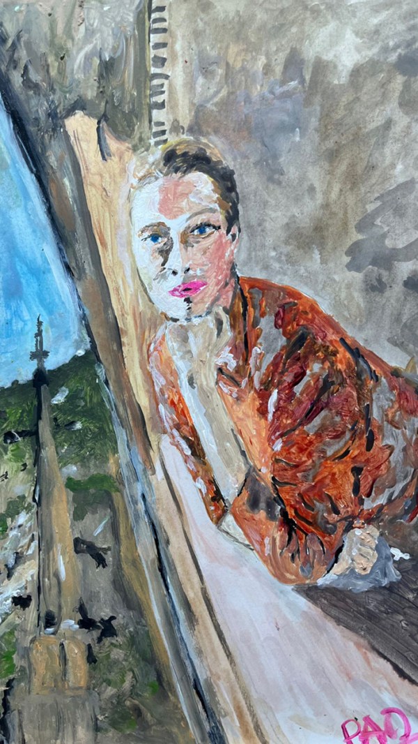 Título: Mujer apoyada en BalcónAutora: Paola TrincadoTécnica: Acrílico sobre papelAño: 2024