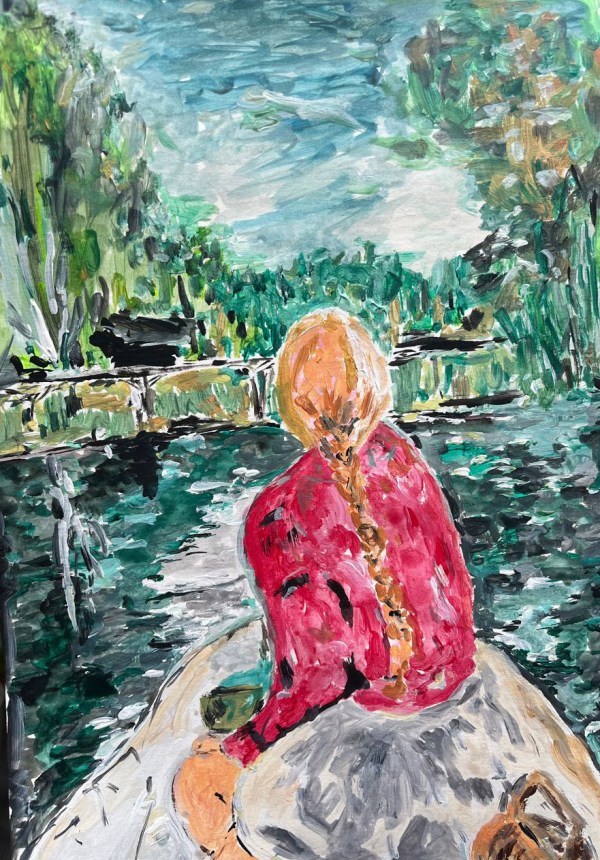Título: Mujer y libro en la arena Autora: Paola Trincado Técnica: acrílico sobre papel Año: 2024